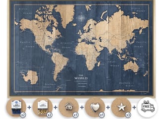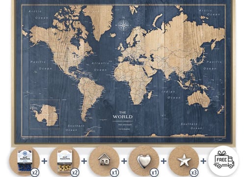 This world map comes with pins. Several styles to suit your lair. Put a pin in every place you've visited or stick a pin where you'll start your world domination plans.